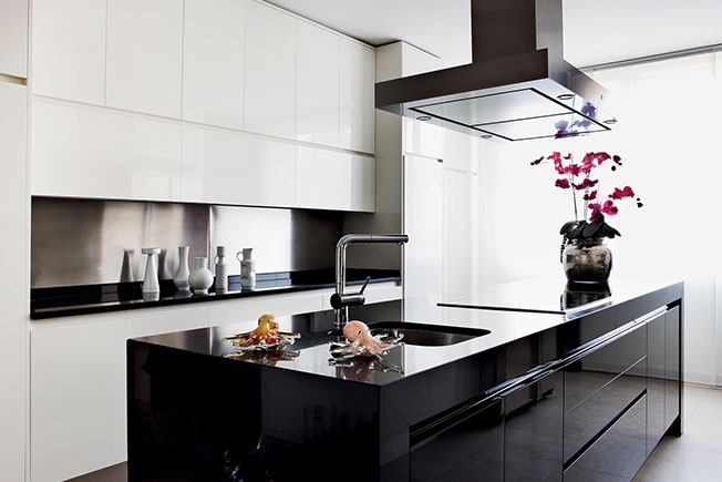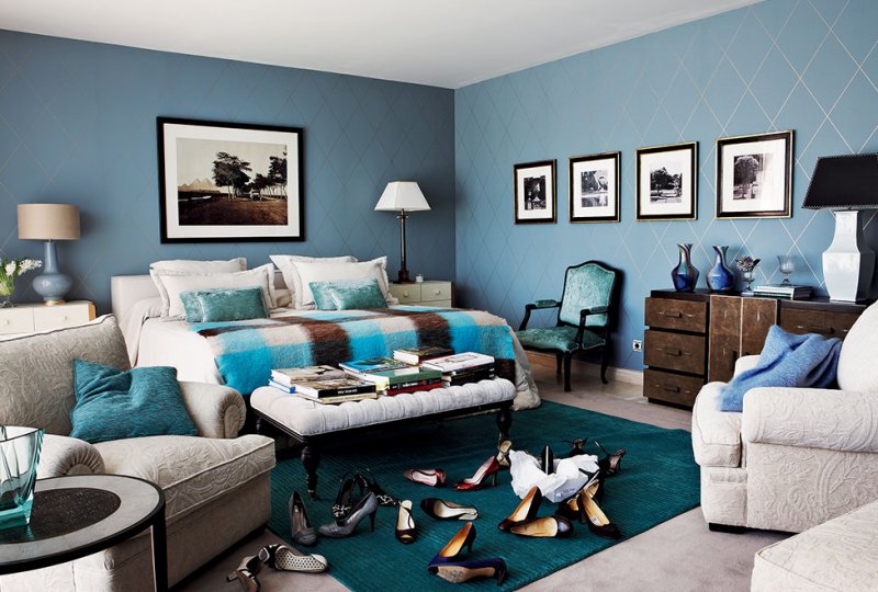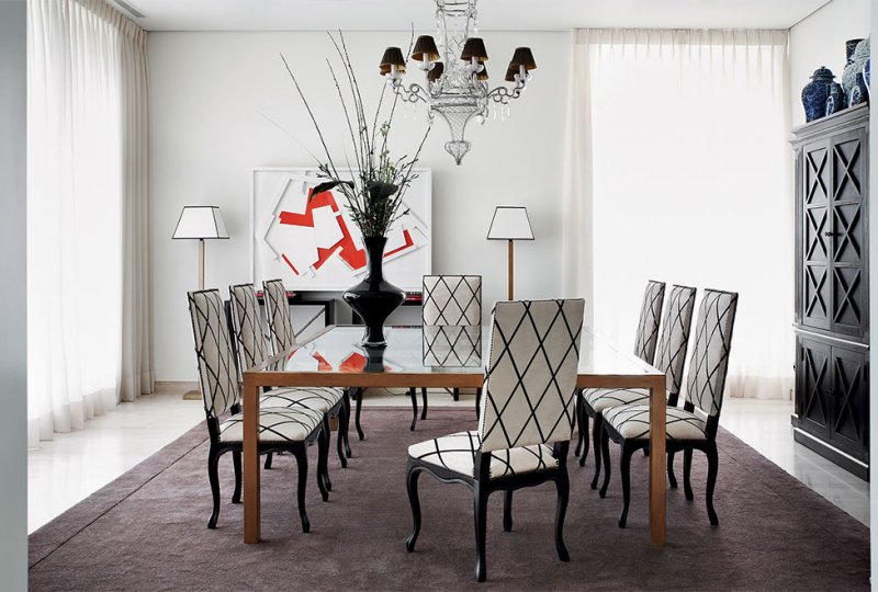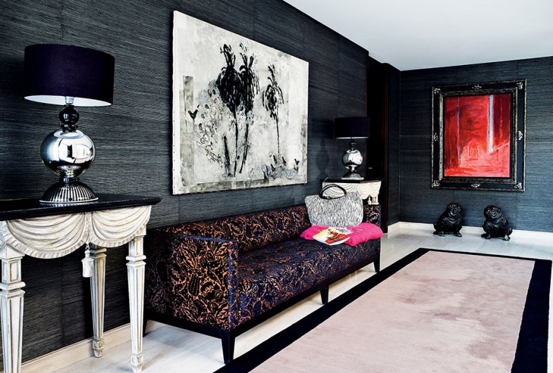«Моя палитра: белый и черный как основа, немного золота и серебра плюс умело рассредоточенные яркие акценты — без цвета жизни не будет! В этом проекте вы можете видеть сочный красный, бирюзовый, «майский» зеленый, фиолетовый — они присутствуют в гостиной и столовой. Для спальни я рекомендую прохладные сизо-голубые тона». Стоит восхититься, как смело Кастилья обращается с черным цветом: прочерчивает им графичные линии на светлом поле, отдает ему крупные предметы и даже целые стены.