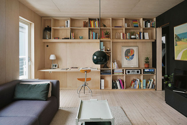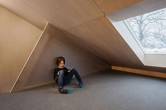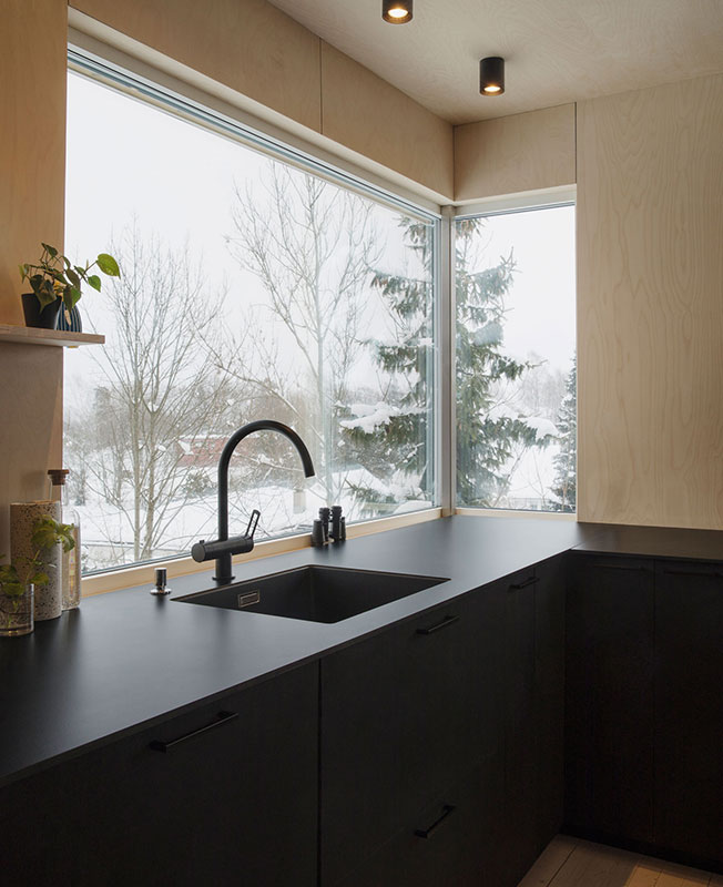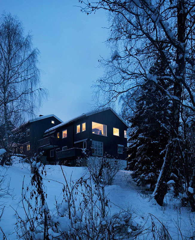 Норвежские архиитекторы Austigard Arkitektur много потрудились для того, чтобы использовать максимум пространства внутри этого, сравнительно небольшого семейного дома в Осло. Центральная его часть со стенами, покрытыми черным или белым тонированным шпоном бука, представляет собой большую семейную столовую с огромным просторным столом 1,5 х 3 м. Стол окружен широкими окнами с видом на заснеженные верхушки деревьев и их лесных обитателей — белок и птиц. Щедрый размер стола означает, что члены семьи могут быть вместе, но при этом заниматься разными делами: трапезой, домашними заданиями, беседами, прокруткой телефона и т. д. Идея состоит в том, что миры могут сосуществовать, не мешая друг другу. Вдали от семейного стола — открытый план и двухуровневые помещения. Кухня, гостиная и библиотека — это отдельные зоны, но не отдельные комнаты. Самая уединенная зона спроектирована так, что здесь удобно сидеть и лежать на широкой многофункциональной скамейке. Лестничный пролет защещен перфорированными панелями из металлической сетки, а хранение спрятано в шкафы под лестницу.