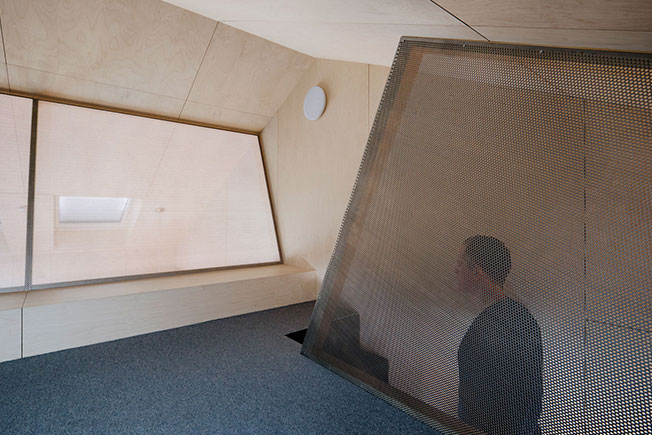 Лестничный пролет защещен перфорированными панелями из металлической сетки, а хранение спрятано в шкафы под лестницу.