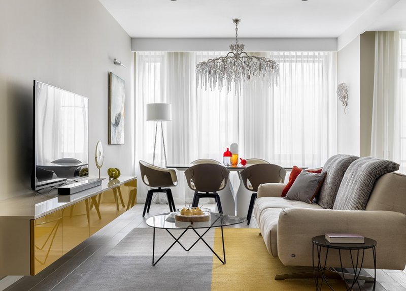 Гостиная. Диван Rolf Benz. Ковер Art De Vivre. Столик Gubi. Тумба под ТВ Misura Emme. В зоне столовой стол Cattelan Italia, стулья Poltrona Frau, торшер Flos. Люстра и бра Brand van Egmond.