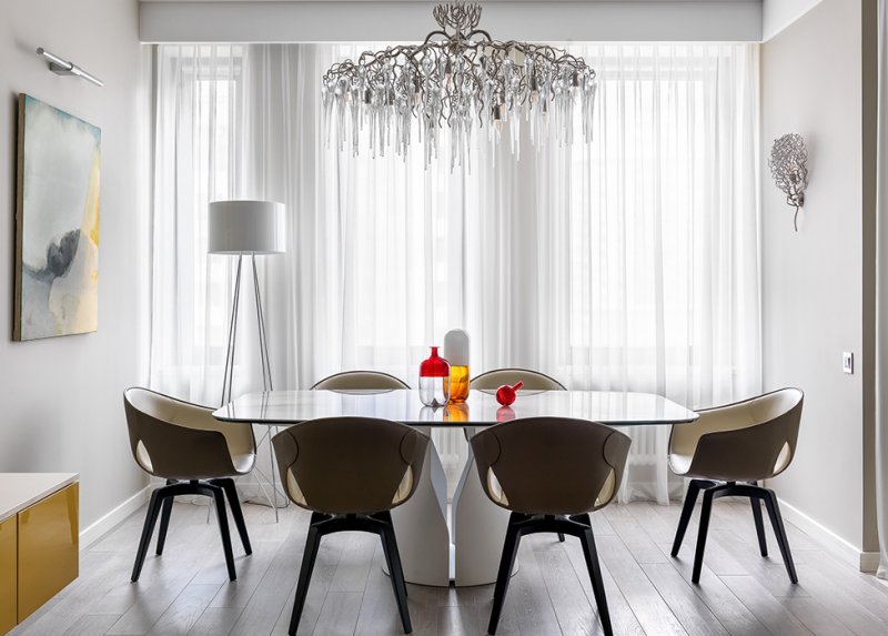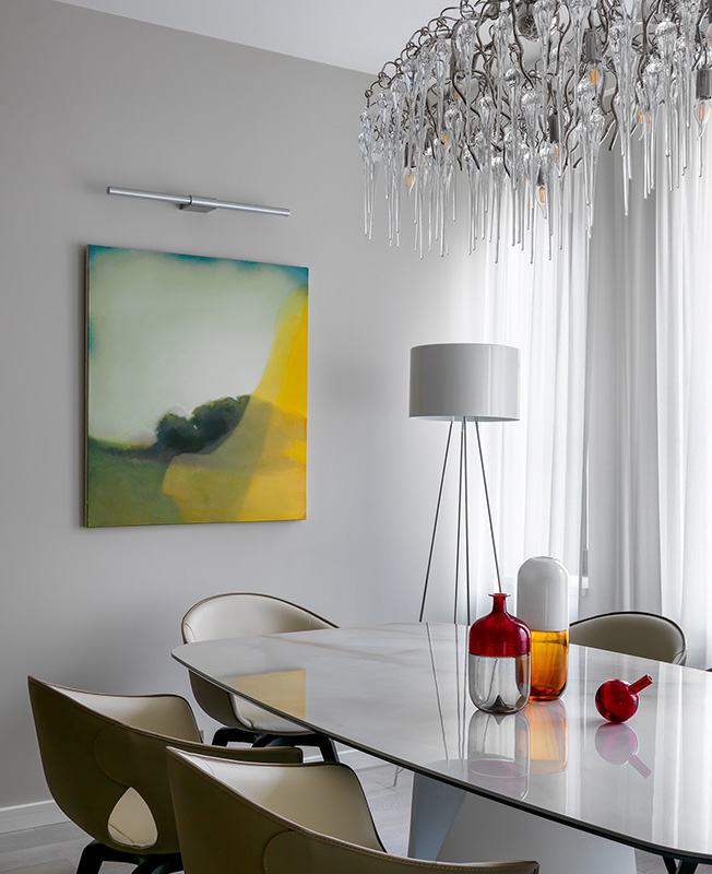 Зона столовой. Стол с керамической столешницей Cattelan Italia. Стулья Poltrona Frau. Торшер Flos. Люстра Brand van Egmond. Вазы Venini. На стене картина Федоры Акимовой, галерея Artis.