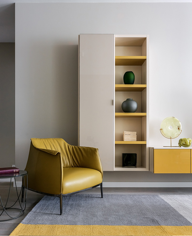 Гостиная. Мебельная композиция Misura Emme. Кожаное кресло Poltrona Frau. Придиванный столик со стеклянной столешницей Rolf Benz. Ковер Art De Vivre. Aксессуары Moon Stores и Happy Collections.