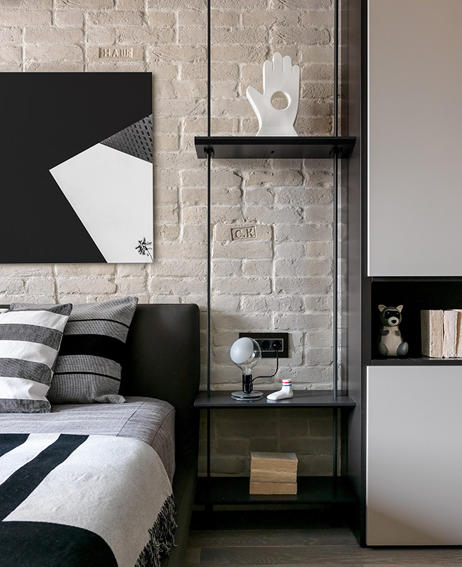 Комната сына отличается цветовой гаммой от остальных помещений и выглядит более брутально. Кровать Sangiacomo. Мебельная композиция Cattelan Italia. Текстиль SDD Project, H&M Home. Cвет Centrsvet.ru. Настольный светильник Diesel by Foscarini. Прикроватный светильник Flos. Над изголовьем фотография Алексея Тудакова, онлайн-галерея Zuzza. Аксессуары Moon Stores Пингвин из магазина Predmety.