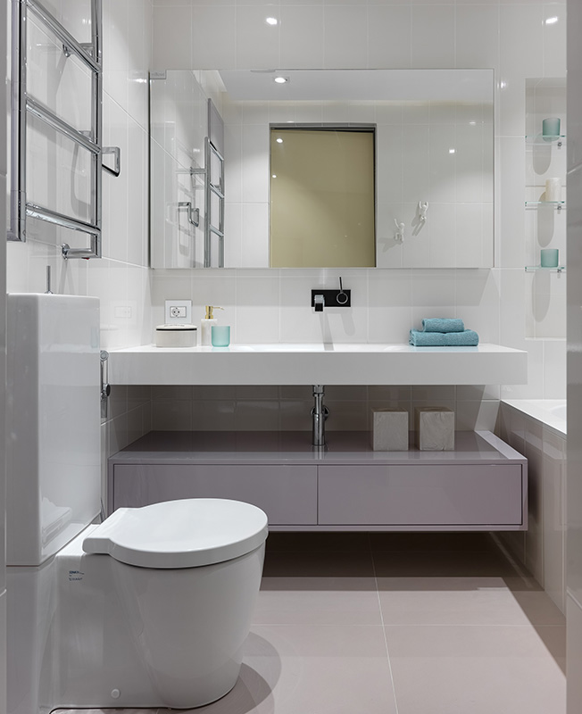 В квартире три спальни: главная и две детские. А также зона кухни, объединённая с гостиной, основной санузел, гостевой санузел и постирочная. Для того, чтобы сохранить ощущение объема, мы пожертвовали идеей о просторной общей гардеробной, вместо этого организовали систему встроенных шкафов в зоне гостиной, а также предусмотрели места для хранения в каждой из спален.