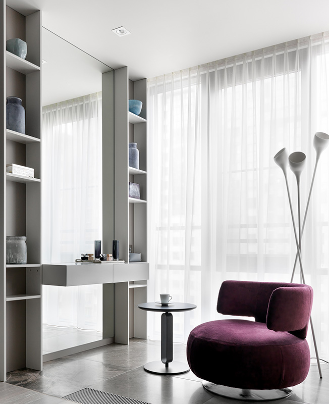 Главная спальня. В присоединенной лоджии устроено подобие будуара. Кресло, торшер Roche Bobois. Кофейный столик Bontempi. Туалетный столик с зеркалом: индивидуальное изготовление по эскизам автора проекта.