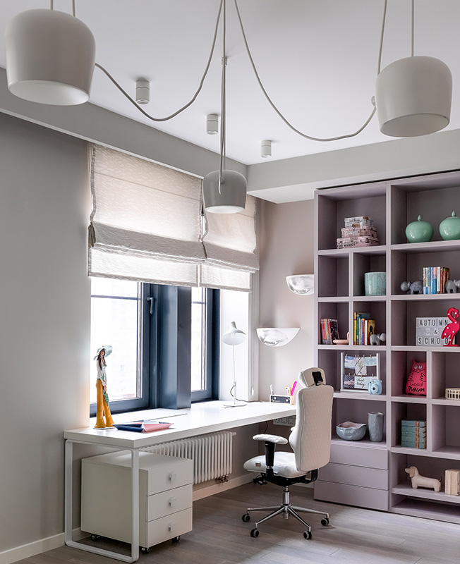 Младшая дочь учится в школе, активно занимается танцами и обучается блогерству. Моей задачей было организовать многофункциональное пространство, где девочка могла бы учиться, осваивать новые танцевальные связки, делать презентации, писать статьи и отдыхать.
