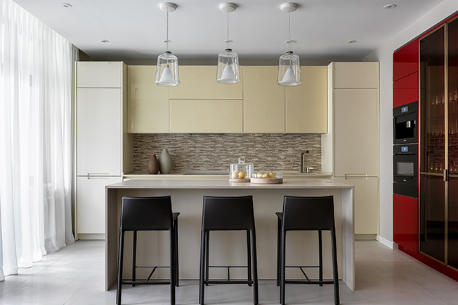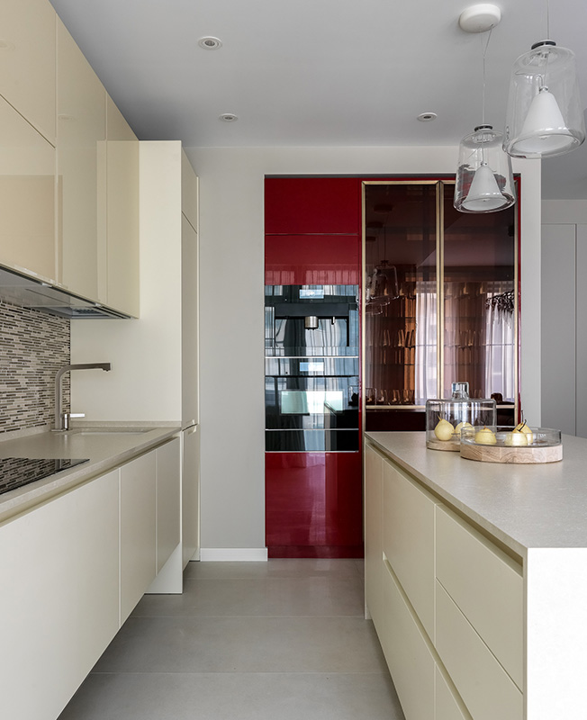 Симметричная композиция основных кухонных шкафов дополнена встроенной колонной цвета спелой клюквы и витриной для бокалов со стеклянными дверцами в латунном профиле.