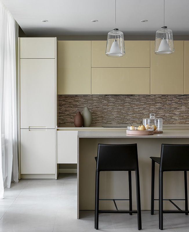 Кухонную мебель фабрики Cesar выбрали в светлых нежных оттенках. Полубарные стулья Cattelan Italia выглядят на ее фоне графичным акцентом.