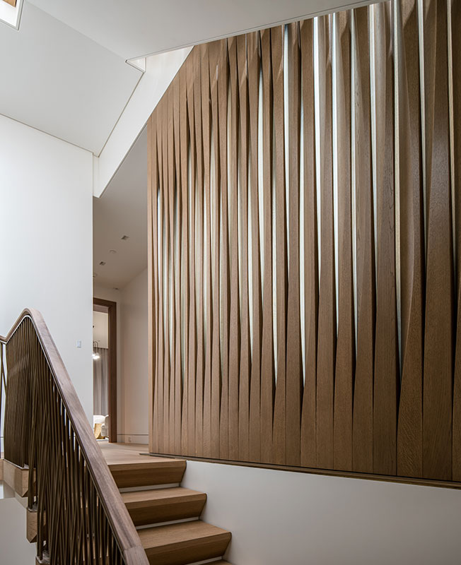 Лестница демонстрирует великолепную работу с материалом. Перила из дымчатого дуба сочетаются с бронзовыми балясинами, ступени выполнены из травертина.