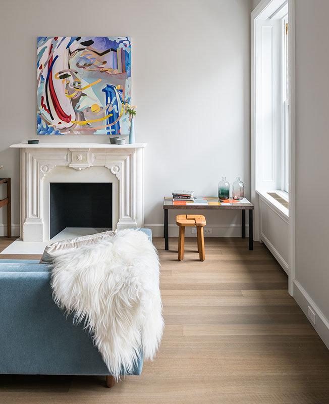 Одна из гостевых спален. Кровать DWR. Письменный стол Jens Rison, стул Fort Standard, настольная лампа Workstead. Диван Ward Bennett в мохере Holland and Sherry. Над камином живописная работа Илоны Савди, 315 Gallery.