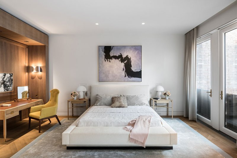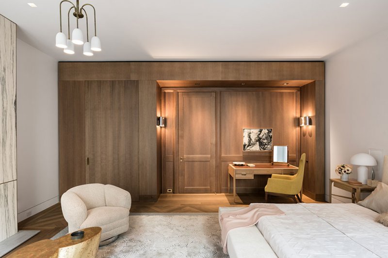 Главная спальня. Кровать с интегрированной банкеткой — дизайн MKCA в текстиле Holly Hunt. Прикроватные столики изготовил на заказ Кристофер Куртц, на них лампы дизайна Вико Маджистретти, Oluce. Туалетный столик в коже изготовлен на заказ KWH. Бра, диз. Тобиа Скарпа, Flos. Винтажная люстра Arredoluce, Rewire Gallery. Стул изготовлен KGBL специально для проекта. Винтажное кресло Владимира Кагана, перед ним столик Венделла Касла. Над столиком работа Николаса Карона.