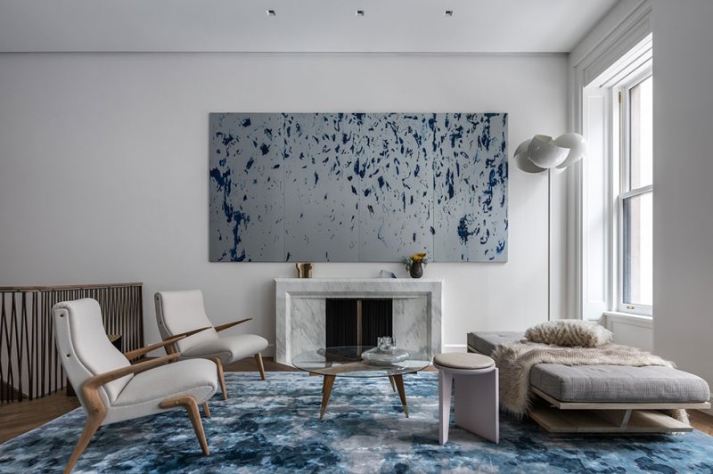 Гостиная на первом этаже сочетает винтажную классику дизайна и предметы, изготовленные мастерами специально для проекта. Винтажные кресла дизайна Освальдо Борсани, столик Джо Понти, торшер Вико Маджистретти. Над камином крупноформатная работа Юзу Оно, Dillon + Lee Gallery. Деревянный стол выполнил Кристофер Куртц, стол из силикона и бронзы — KGBL.