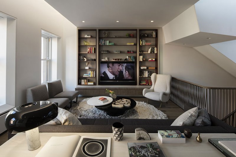 Этаж библиотеки. Диван изготовлен на заказ Egg Collective. Винтажное кресло, диз. Марко Занузо, Compasso Gallery. Ковер из фетра и мохера сделан на заказ Даной Барнес. Лампа Snoopy — шедевр Акилле Кастильони для Flos. Cтолик из мрамора и бронзы выполнил дизайнер-скульптор Эрик Шмитт.
