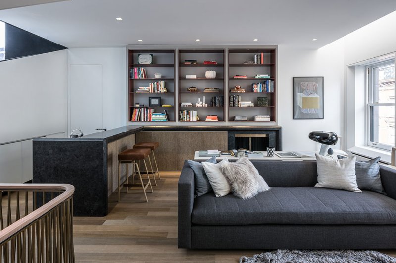 В зоне библиотеки оборудована компактная кухня. Диван изготовлен на заказ Egg Collective, ковер из фетра и мохера — работа Даны Барнес. Столик из бронзы и мрамора выполнил дизайнер-скульптор Эрик Шмитт. Барные табуреты KGBL.