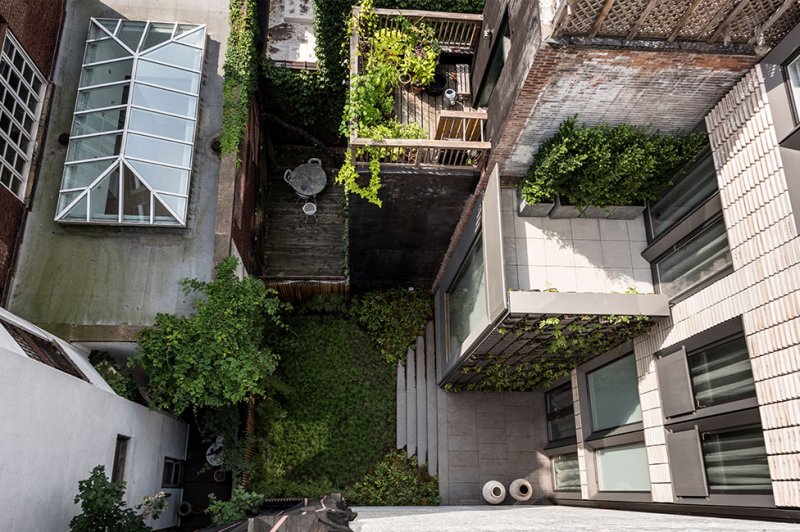 Майкл Чен облицевал фасад керамическими блоками и выстроил вертикальный сад с умной системой орошения: сад nano-biome можно наблюдать как с наружной стороны дома, так и изнутри, через огромные вытянутые окна. В нем высадили 12 видов растений, некоторые из которых (такие, как камчатский очиток) находятся под угрозой исчезновения в Нью-Йорке. Привлеченные к проекту ученые и ботаники Suny считают, что подобные вертикальные сады могут быть неплохим способом сохранения редкой флоры: тут учли и оптимальную температуру, и количество влаги, и распределение света. Для экологического анализа и прогноза специально разработаны цифровые методы проектирования.