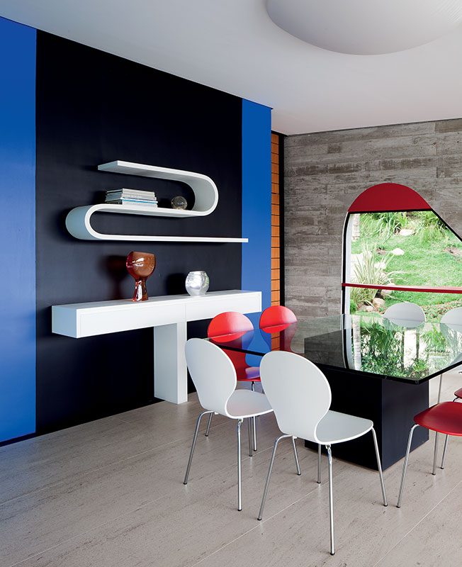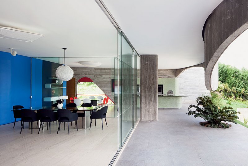 С первого взгляда очевидно: эту виллу построил бразильский архитектор Руи Отаке. Невероятная пластика голого бетона в сочетании с ярким цветом — Отаке ни с кем не спутаешь. «Моя архитектура отражает наше время, но смотрит в будущее. Она инновационна, согласована c назначением здания (жилой дом, офис, школа и пр.) и отличается провокационными формами: я предпочитаю сюрпризы плавных дуг, а не предсказуемость прямых углов. Как правило, я избегаю чрезмерной дробности внутренних пространств, чтобы стимулировать коммуникацию, и стараюсь создавать объемы, красивые сами по себе: такие не требуют дополнительной отделки. Лестница заворачивается лихой спиралью, огибая лаунж-зону. Конструкция вносит разнообразие в «материальный мир» виллы: с одной стороны у нее заграждения из бетона, с другой — из стекла; ступени из дерева. Края отделаны алюминием. Обратите внимание: я не минималист! Динамика форм придает моему стилю теплоту. Своим учителем считаю Оскара Нимейера: он сделал бразильскую архитектуру узнаваемой во всем мире, он на голову выше тех, чьи проекты публикуют, иллюстрируя «экономический подъем в Бразилии». Лестница — монументальная конструкция со смещенной осью симметрии. Сочетает бетон разных оттенков и фактур. Диван, диз. Ч. Боэри, Arflex. Справа, на столике, диз. Э. Сааринен, Knoll, лампа, диз. Ф. Старк, Flos. Дом в Валиньосе (это в 100 км от Сан-Паулу) я построил для Люсии и Михаэля. Ей 35, ему 40, и у них трое детей (пока!). Молодые люди любят природу и здоровый образ жизни, отпуск проводят в Германии, где живут родители Михаэля. Длина участка составляет 70 м, перепад высот — 14 м. Стол с основанием из бетона по проекту Р. Отаке. Кресла Swan, диз. А. Якобсен, Fritz Hansen. На стене — работа Т. Отаке — 99-летней мамы архитектора. Ваза, диз. А. Миранда. Я поставил дом в глубине на самой высокой точке, чтобы выиграть приватное пространство. Перед зданием — сад с бассейном, так что все спальни, гостиная, столовая, кухня смотрят на ландшафт. Пара имеет возможность работать дома на удаленном доступе: посмотрите, какой роскошный домашний офис мы им сделали — с отдельной террасой! Западный фасад, выходящий на улицу, почти глухой — таким он сделан в целях безопасности. Если бы не цвет, здание выглядело бы мрачным бункером. За синими стальными панелями — окно домашнего офиса. Они защищают его от солнца. Сегодня архитектура глобализуется, и если бы я строил виллу в России, то сохранил бы свои ни на что не похожие кривые линии. При этом добавил бы русской культурной идентичности. Возможно, больше мягкого текстиля. Я создал бы уютные, обязательно высокие пространства с интересными пропорциями. Еще использовал бы много стекла — оно необходимо, чтобы завязать диалог с садом». Пространство первого уровня. Стеклянные раздвижные перегородки образуют условную границу между функциональными зонами, а также домом и садом. Поверхности двойной кривизны — особенность архитектуры Отаке. «Архитектура должна удивлять и вызывать эмоции», — считает патриарх. Основной материал в проектах Руи Отаке — бетон. Он и строительный, и отделочный. То же самое относится и к другим бразильским архитекторам, но никто не использует податливость бетона так, как Отаке: он мнет его словно пластилин, закручивает спиралью, создает поверхности двойной кривизны. Дом расположен в глубине участка на самой высокой т