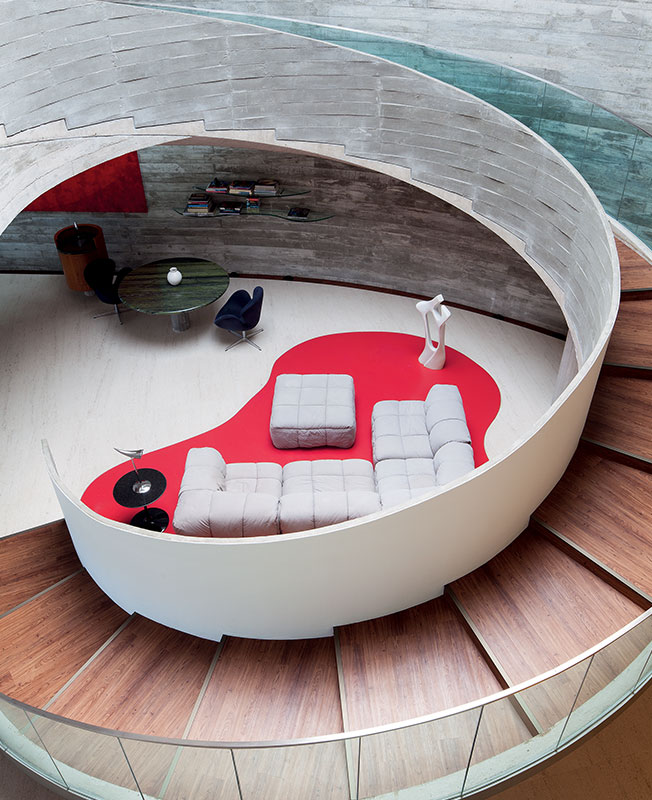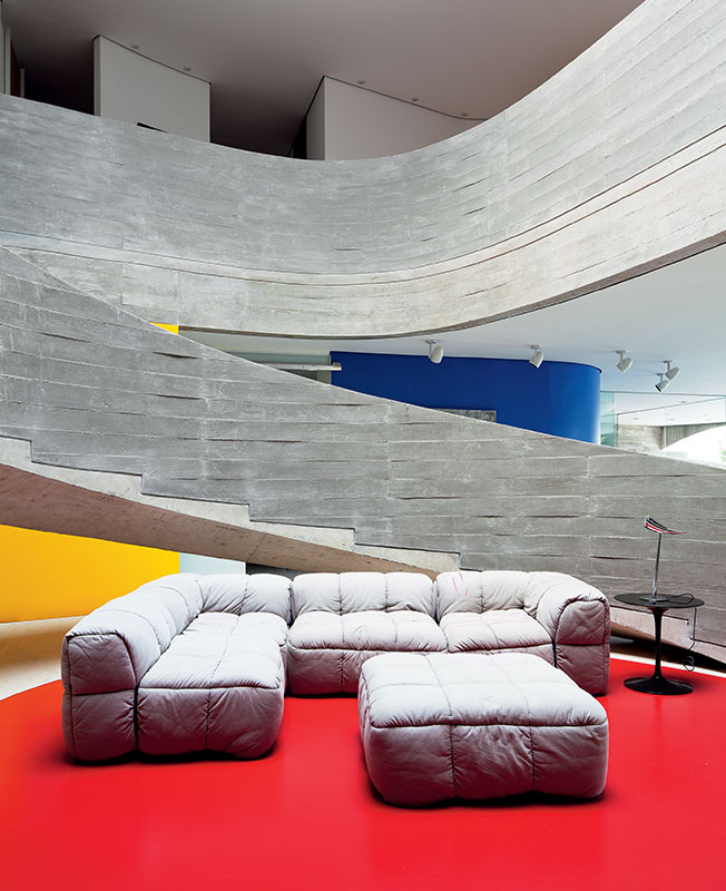 Лестница — монументальная конструкция со смещенной осью симметрии. Сочетает бетон разных оттенков и фактур. Диван, диз. Ч. Боэри, Arflex. Справа, на столике, диз. Э. Сааринен, Knoll, лампа, диз. Ф. Старк, Flos.