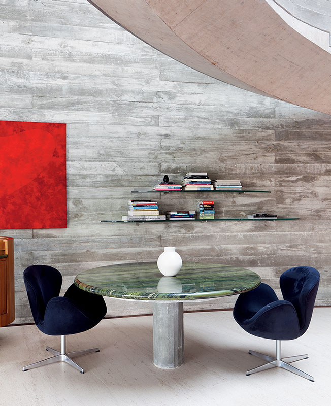 Стол с основанием из бетона по проекту Р. Отаке. Кресла Swan, диз. А. Якобсен, Fritz Hansen. На стене — работа Т. Отаке — 99-летней мамы архитектора. Ваза, диз. А. Миранда.