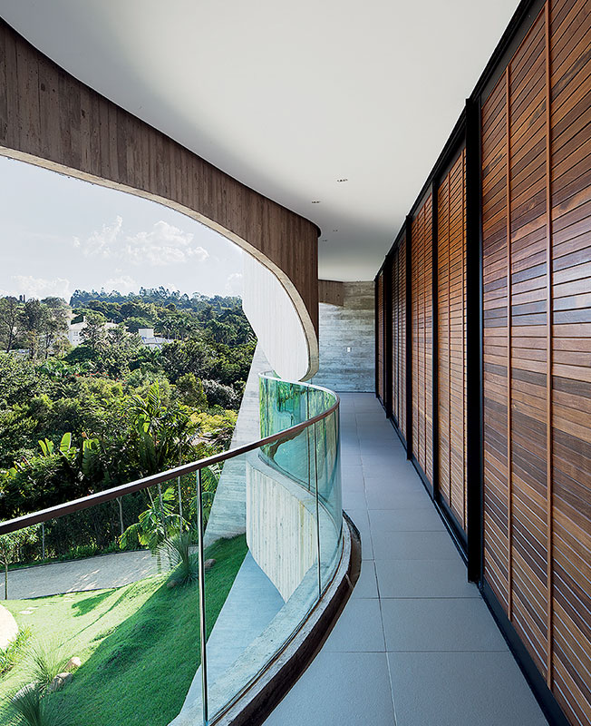 В жаркой Бразилии архитектор, с одной стороны, решает задачу, как раскрыть дом в природу, а с другой — как защитить его от солнца. Open space на первом этаже имеет сплошное остекление, раздвижные перегородки создают прозрачную границу с садом.