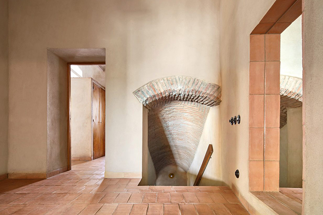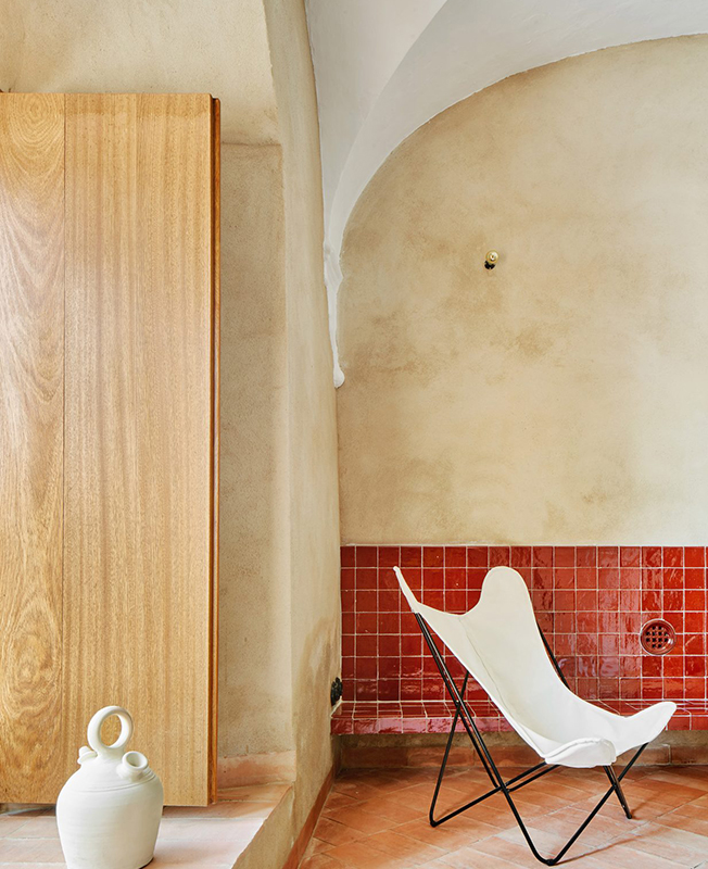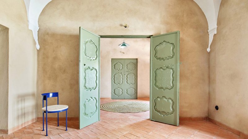 Несколько оригинальных деревянных дверей, богато декорированные узорами, окрашены в бледно-зеленый цвет с тонким отсылом к виноградникам региона. Пара новых дверных проемов была создана, чтобы дать гостям лучший доступ во внутренний двор с плавательным бассейном, который облицован той же глиняной плиткой, что и пол.