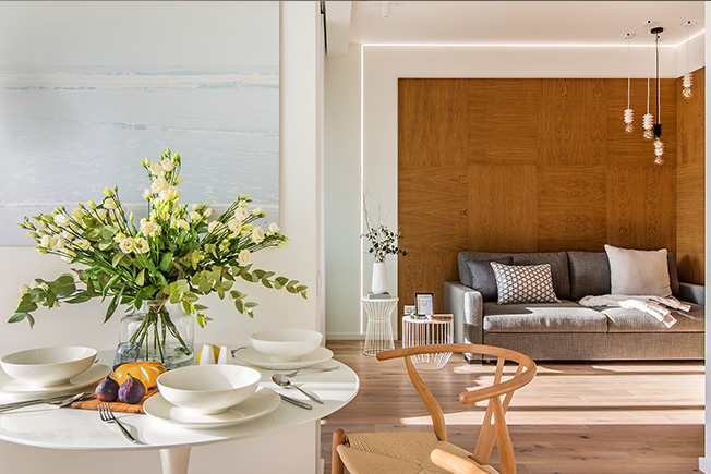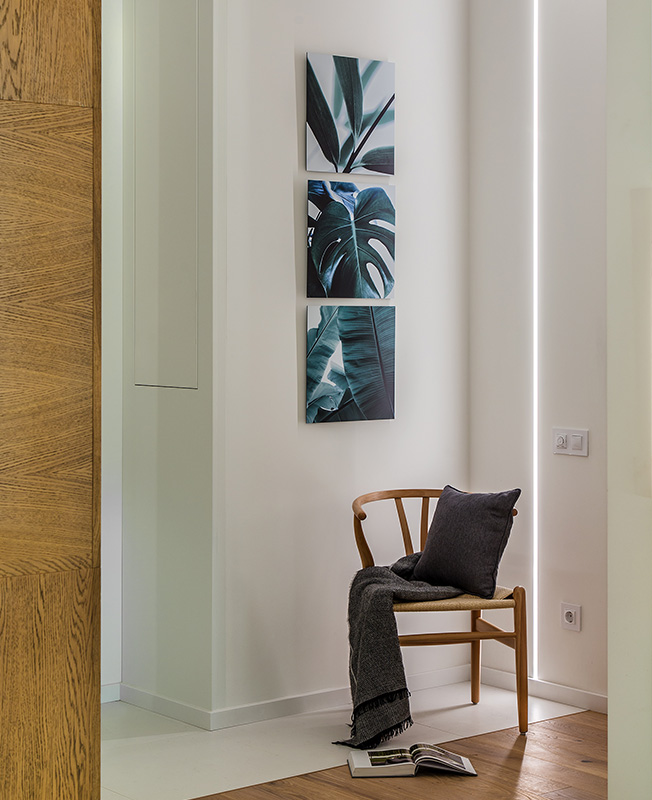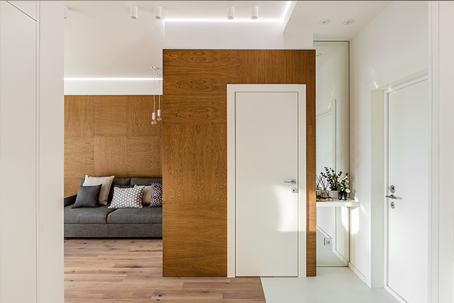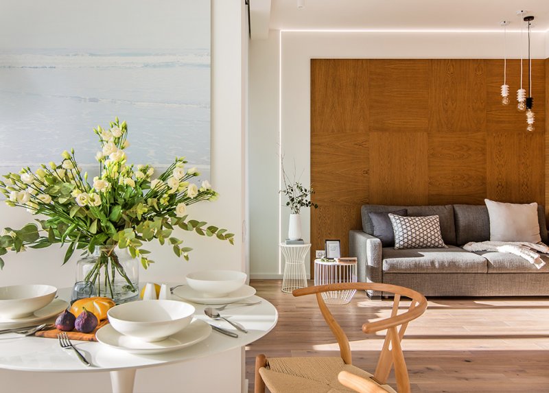 Cтилистика проекта — скандинавский минимализм. Один из любимых стилей в современном мегаполисе, он позволяет отдохнуть в стенах дома от насыщенных будней и ярких красок. Только белый, дерево и текстиль классического серого цвета — ничего лишнего. Все шкафы — встроенные, белые, сливающиеся со стеной. Отделка из шпона дерева на стенах делает интерьер необычным и создает уют.