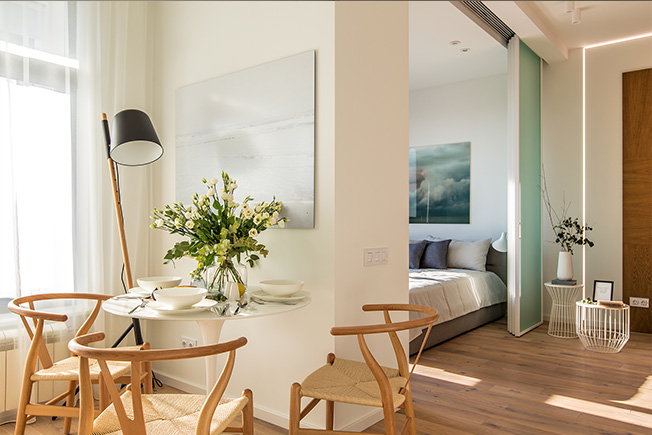 Основную задачу, которую я поставила сама перед собой — создать ощущение воздушного большого пространства. Для этого необходим правильно спланированный свет. Спроектировать свет — большая проблема во многих интерьерах. Важно, чтобы днем естественное освещение проникало во все жилые зоны, а вечером была возможность варьировать сценарии. Иметь не только максимально яркий, при котором хорошо просматривает каждый уголок квартиры, но и приглушенный — при котором ты, придя с работы домой, наливаешь себе бокал красного вина и созерцаешь город в панорамных окнах.
