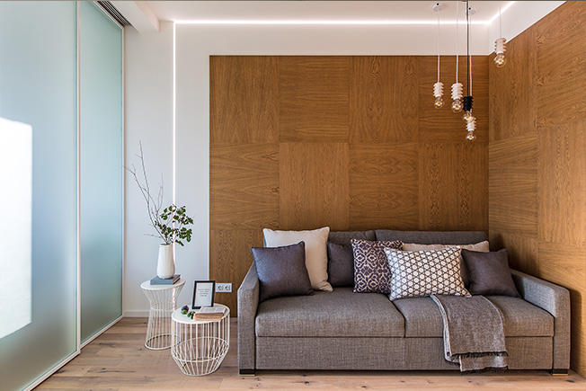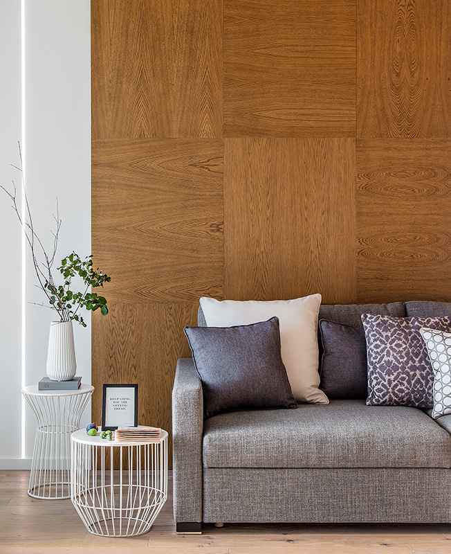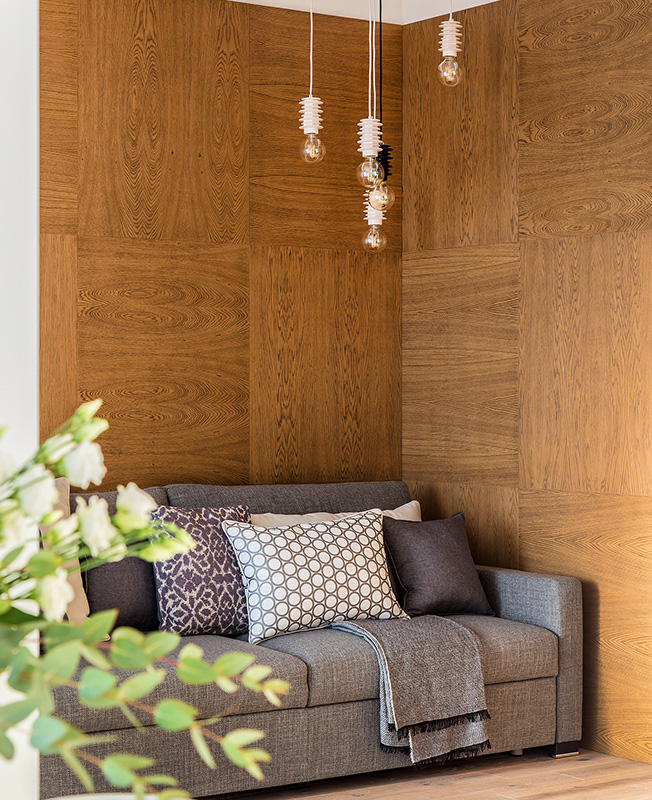 Диванная зона выделена шпоном. Его разнонаправленный рисунок создает декоративный эффект.