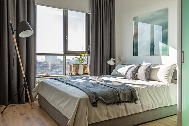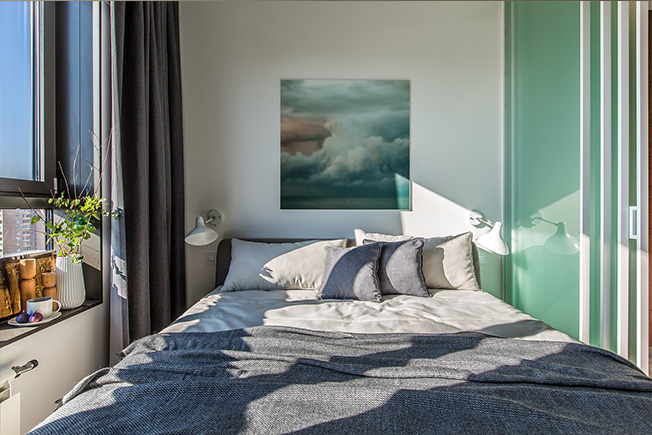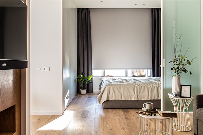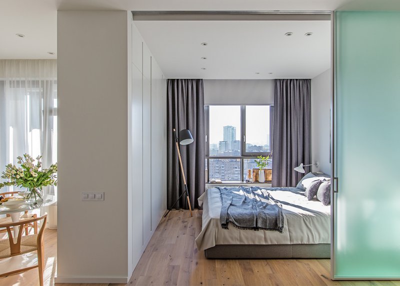 Спальня отделена раздвижной перегородкой из матового стекла. Встроенный шкаф не считывается как объем, сливается со стеной. Портьеры и рулонные шторы blackout на окнах не пропускают свет. На полу инженерная доска Finex.