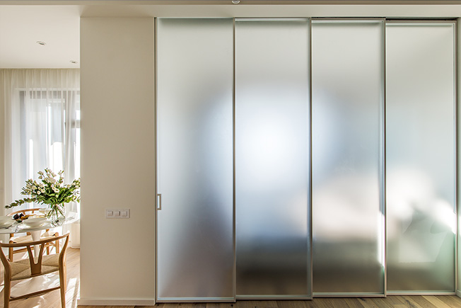 Раздвижная перегородка из матового стекла пропускает свет, в то же время позволяет уединиться.