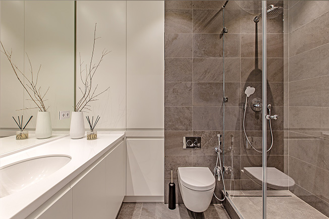 В ванной создана просторная душевая кабина. Оборудование Villeroy&Boch, Hansgrohe. Отделка: керамогранит Porcelanosa.