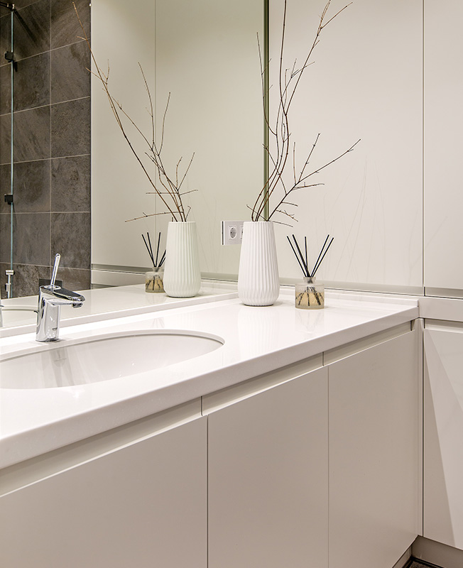 В ванной создана просторная душевая кабина. Оборудование Villeroy&Boch, Hansgrohe. Во встроенном шкафу есть отделения для белья, моющих средств и стиральной машины. Отделка: керамогранит Porcelanosa.