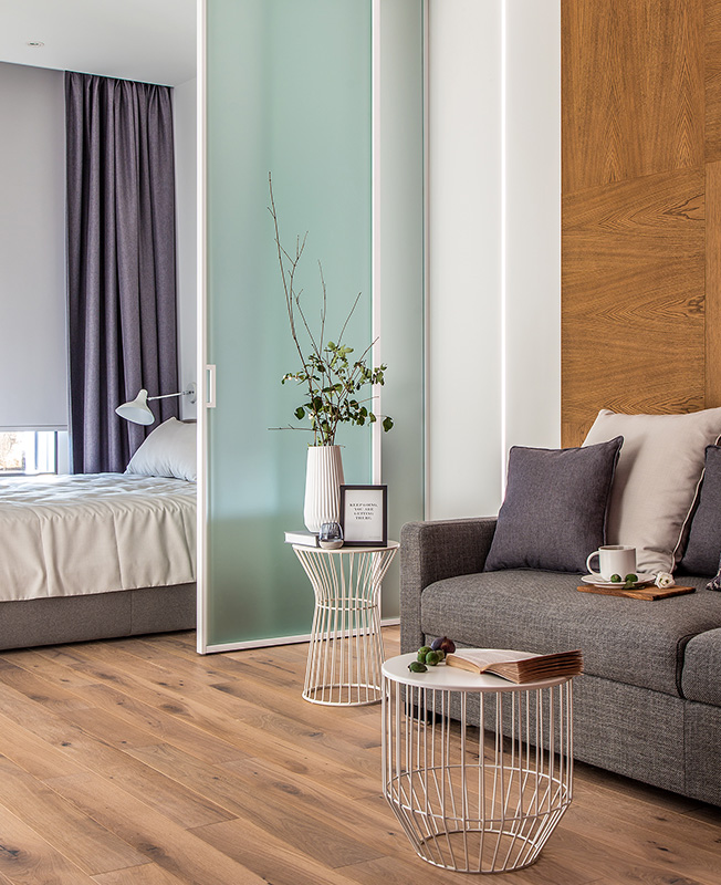 От опен спейса спальню отделяет раздвижная перегородка из матового стекла. Столики BoConcept. На полу доска Finest c ярко выраженной фактурой дерева.