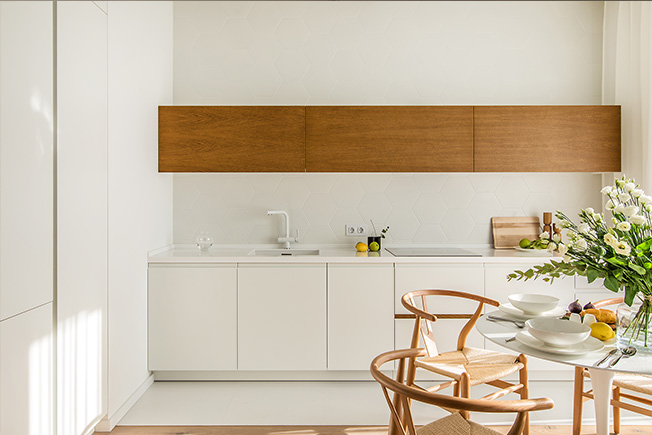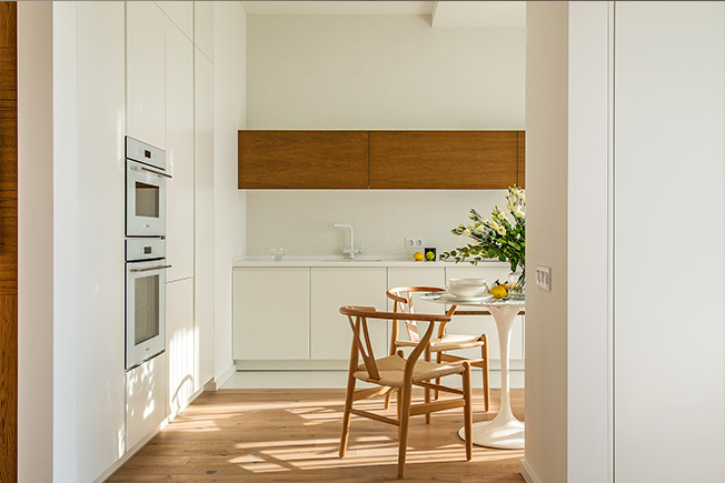 Обеденная группа размещена в зоне кухни. Стулья Wishbone — классика скандинавского дизайна, созданная Хансом Вегнером в 1949 году для Carl Hansen & Son. Как и стол Tulip — модель Ээро Сааринена, Knoll.