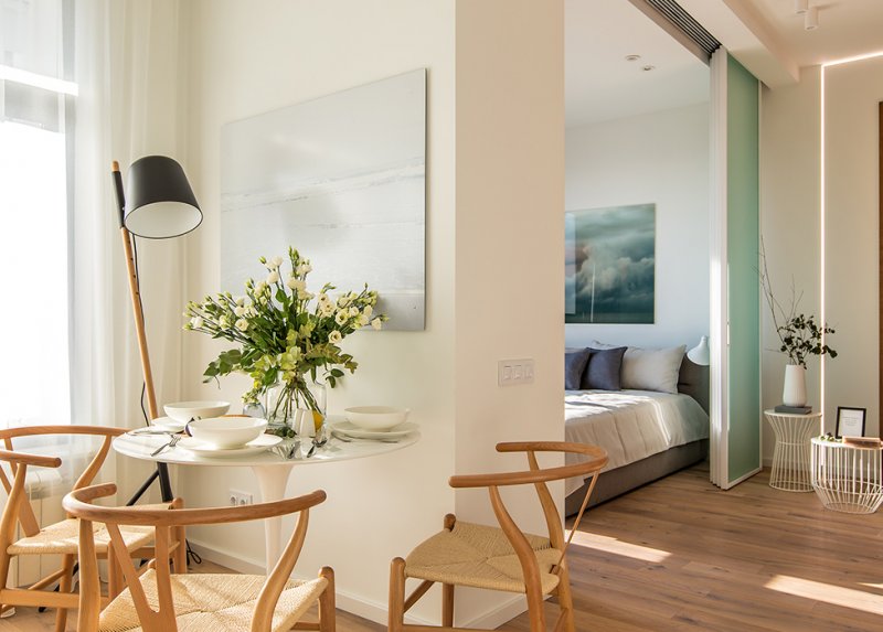 Обеденная группа размещена в зоне кухни. Стулья Wishbone — классика скандинавского дизайна, созданная Хансом Вегнером в 1949 году для компании Carl Hansen & Son. Как и стол Tulip — модель Ээро Сааринена, Knoll. Торшер Outrigger Хендрика Петерсена и компании BoСoncept — современный образец скандинавского стиля.
