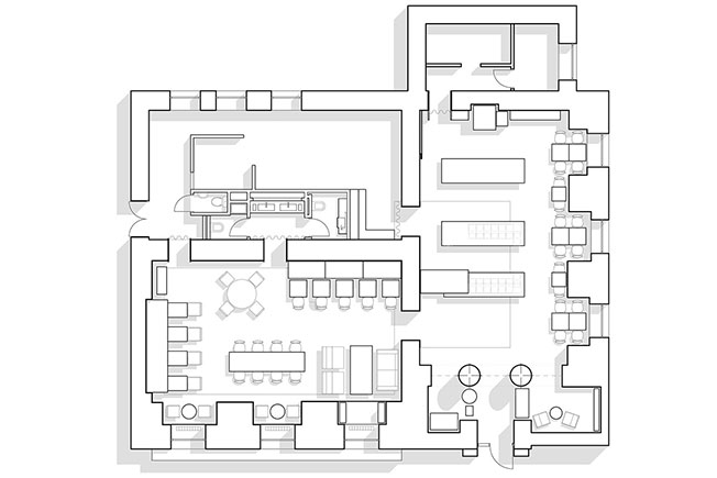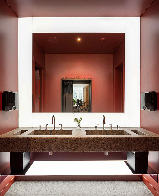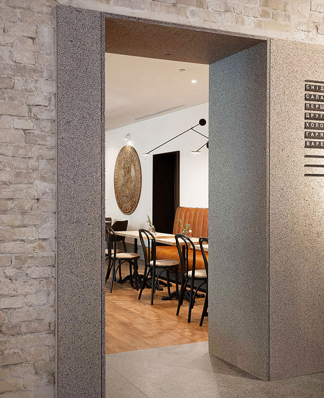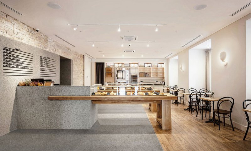 Пространство разделили на два зала. В первом разместили три больших деревянных стола для демонстрации свежей выпечки. Пироги готовят прямо на глазах посетителей: весь процесс можно наблюдать от начала и до конца. Деревянные столы гармонично сочетаются с полом из натурального гранита, который плавно перетекает в отделку стен.