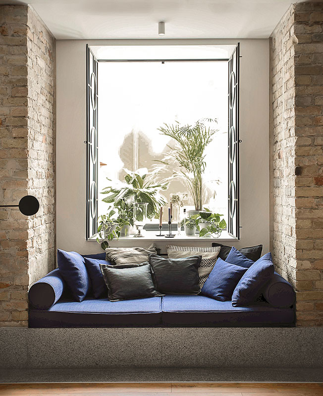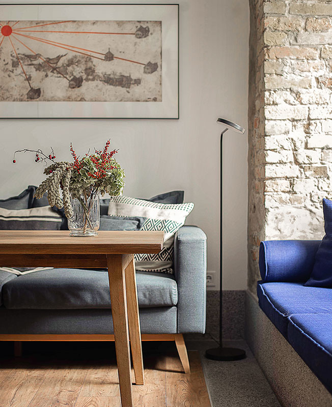 В интерьере пересекаются самые разнообразные фактуры — текстиль и кожа, металл и древесина, открытая кирпичная кладка и гранит.