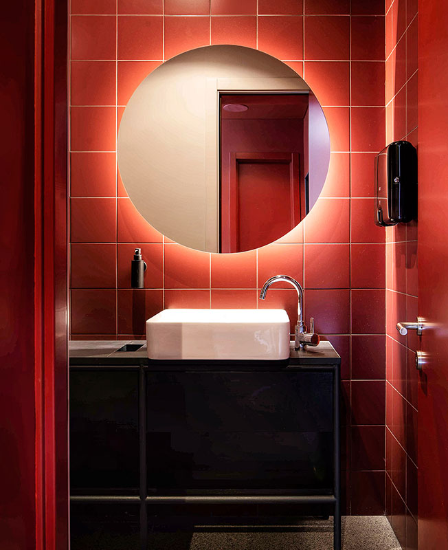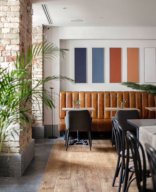 Второй зал предлагает традиционные столики на разное количество гостей. Лаконичный интерьер дополнен яркими акцентами — синими диванами в оконных нишах, цветными панно и большим количеством зелени. Завершает образ ярко-бордовый санузел.