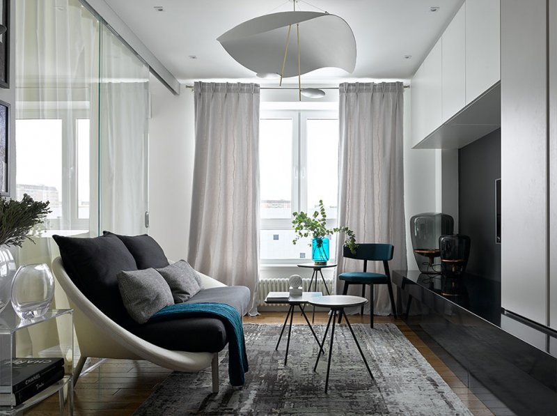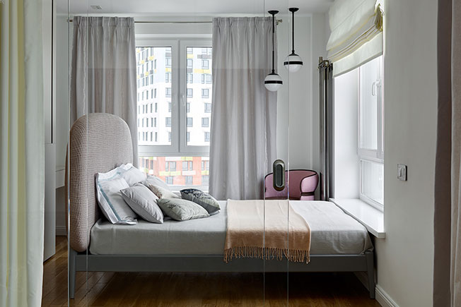 При этом спальня отделена от гостиной стеклянной перегородкой. Создать приватную обстановку можно при помощи драпировки из натурального хлопка.