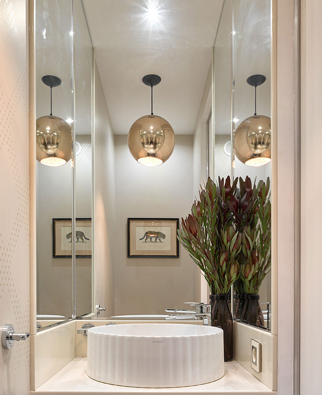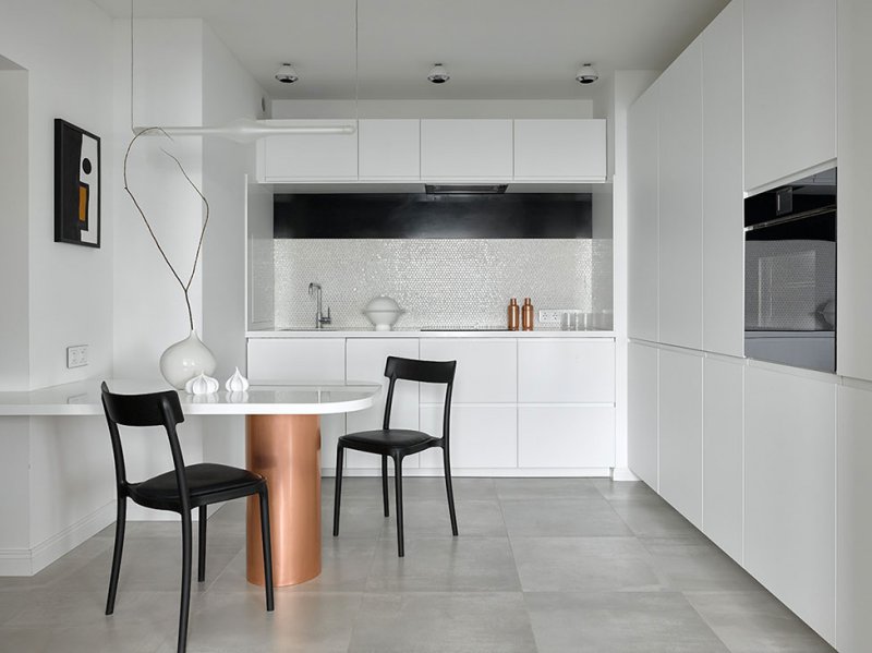 Интерьер оформлен в сдержанной цветовой палитре: для спальни в пастельных тонах использовали жемчужно-серый и пудро-розовый, в гостиной черно-белый монохром дополнен глубоким сине-зеленым, в кухне акцент сделан на медной ножке обеденного стола.