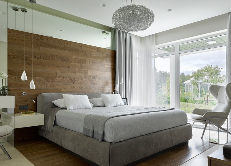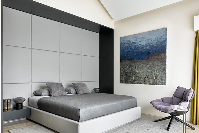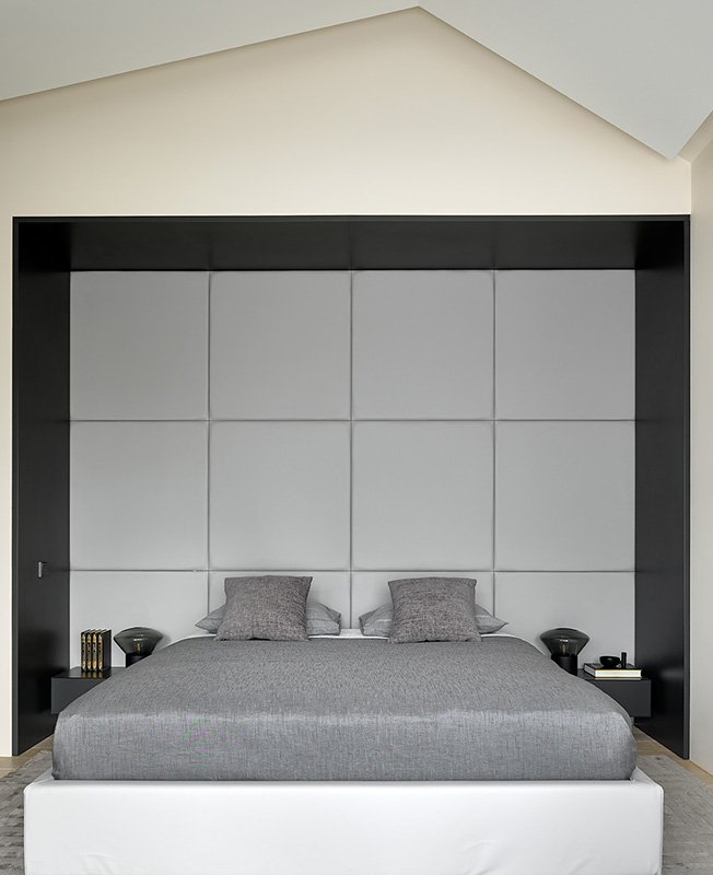 Спальня хозяев — единственная комната c плоским потолком. Кровать Flou. Кресло Cassina. Люстра Catellani&Smith. Подвесные светильники Bocci