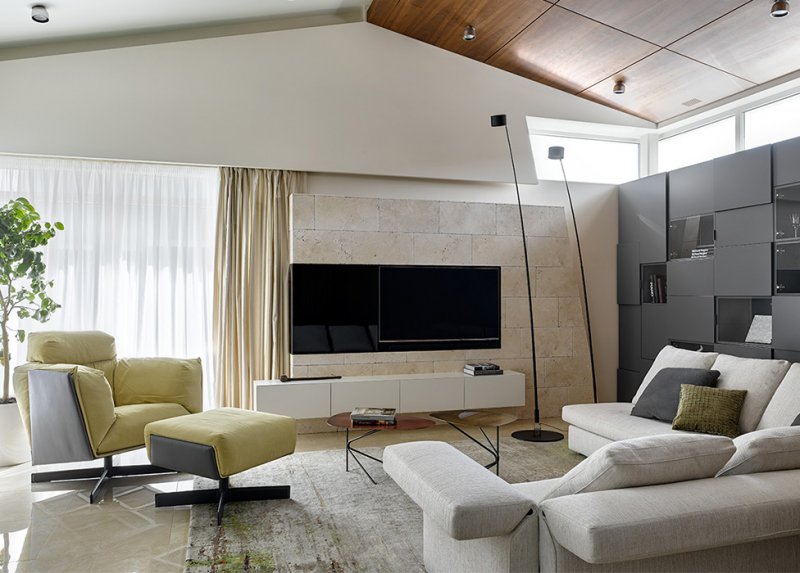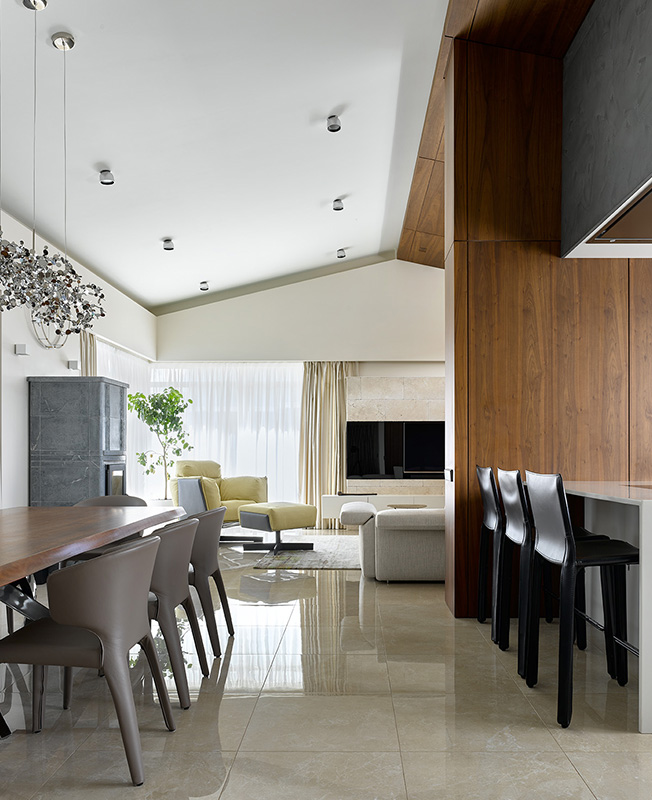 В отделке от заказчиков было одно пожелания — пол из керамогранита на всем первом этаже, кроме спальни. ТВ-стена и стена при входе отделаны натуральным травертином с очень красивой фактурой. Камень заказывали в Италии. Стеновые и потолочные панели из шпона американского ореха изготовлены специально для этого проекта в столярной мастерской. Так нам удалось связать и сделать законченным большое пространство — высота гостиной достигает шести метров. Потолок имел один угол ската и в белом цвете выглядел бы неуютно и чужеродно. За счет панелей мы получили второй уклон.