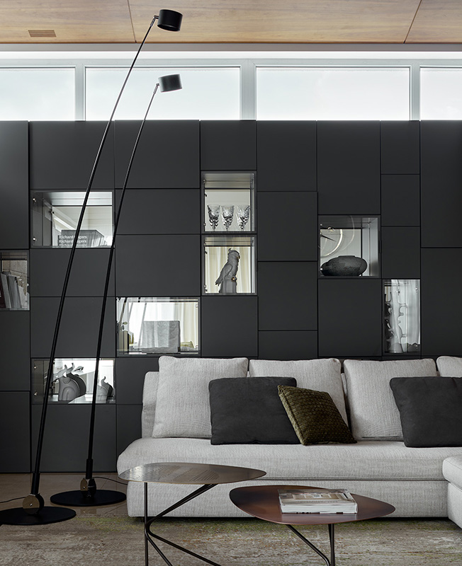 Высокие торшеры Davide Groppi соразмерны масштабам гостиной. Тонкая модель удачно выглядит в парном варианте. Диван Minotti, столики De Castelli. Стеллаж изготовлен на заказ.