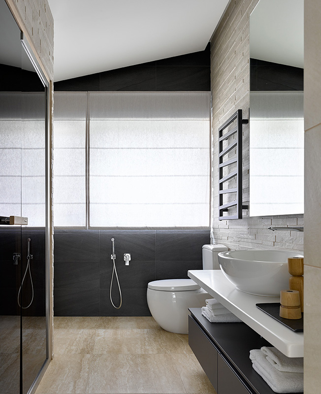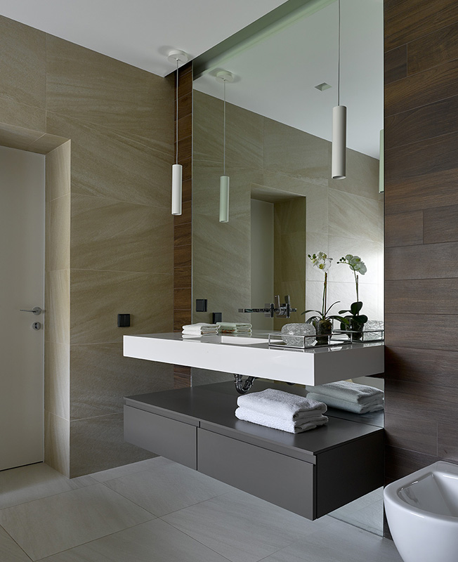Главная ванная комната отделана керамогранитом Supergres. Оборудование: Antoniolupi, Villeroy&Boch, Hansgrohe. Подстолье под раковину Gessi.