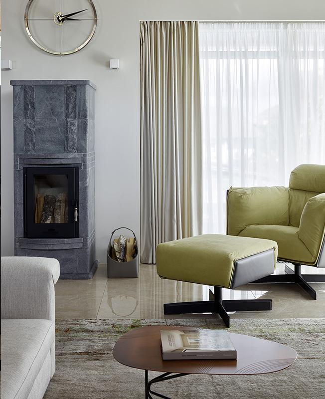 Диван в гостиную подбирали долго: важно, чтобы он выглядел легким и красивым со всех сторон. Предпочли Collar от любимой фабрики Minotti. Но самым сложным оказался выбор кресла для хозяина дома. Критериев было много: удобно, нестандартно, красиво, крутиться должно, не реклайнер. Оптимальной оказалась модель голландского бренда Piet Boon. Хотя до этого перебрали все мыслимые и немыслимые фабрики.