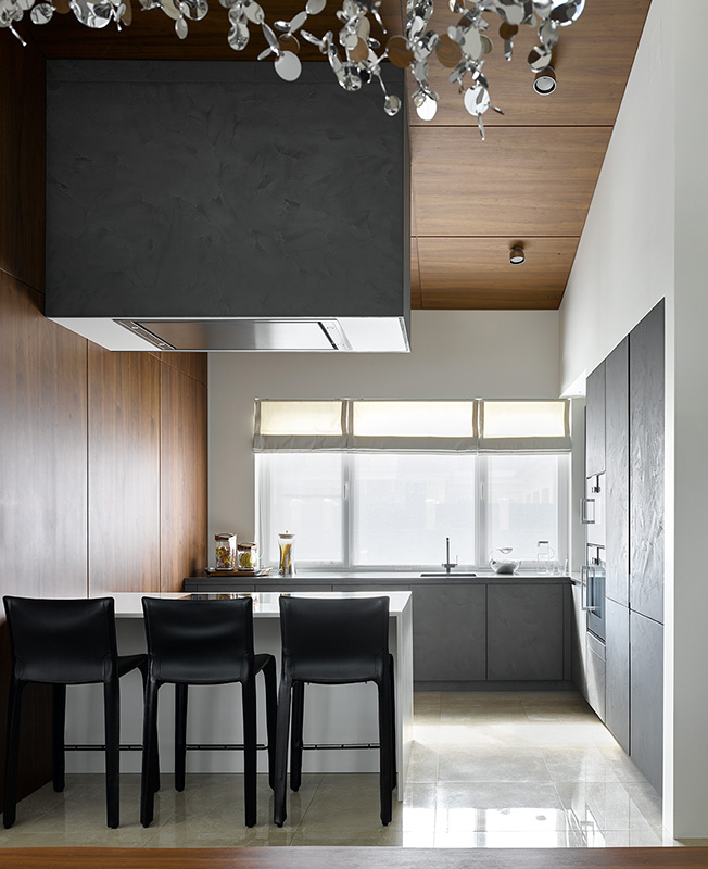 Из-за конструктивных особенностей дома не было возможности встроить вытяжку в столешницу, а обычные островные модели работают только на высоте не больше 75 см. Поэтому мы остановились на потолочной вытяжке Gutmann. Она может работать на высоте до трех метров, и мы собрали вокруг «бетонный» куб из того же материала что и фасады кухни. Это решение позволило не только решить техническую задачу, но и сохранить эстетическую цельность.