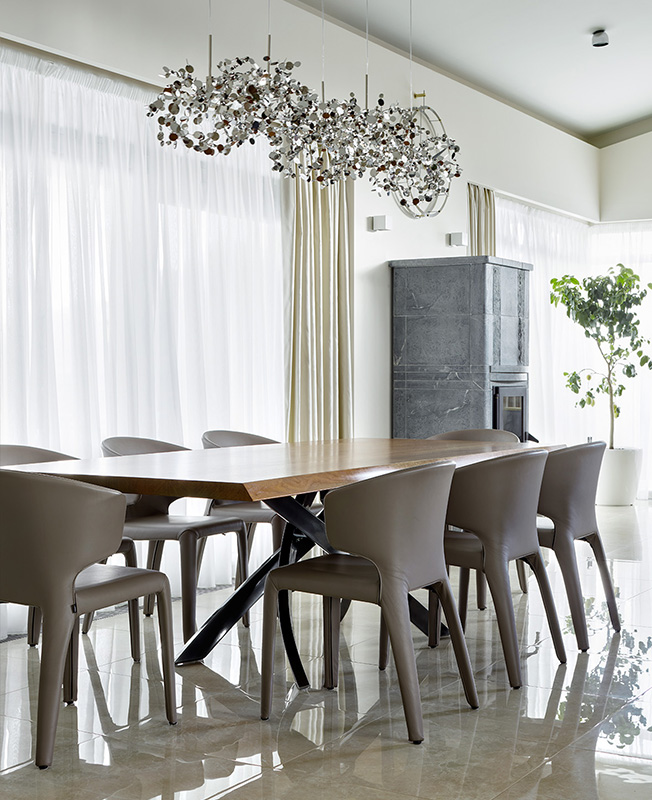 На всем первом этаже, кроме спальни, пол отделан керамогранитом. Стол Bonaldo, стулья в кожаной обивке Cassina. Люстра Terzani.
