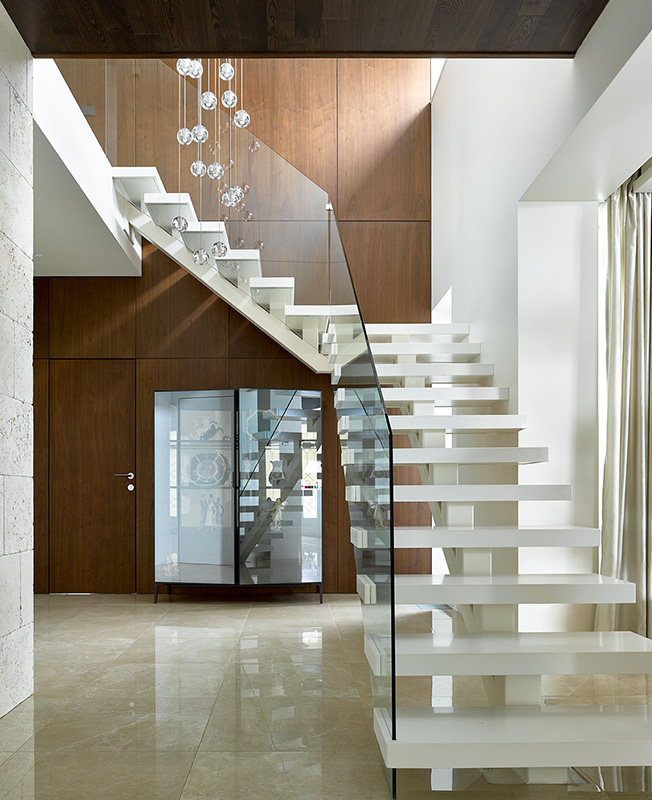 Лестница выполнена из кварца и стекла. Невидимые крепления — особая гордость авторов проекта. Люстра Fabbian. Витрина Rimadesio. Пол на всем первом этаже, кроме спальни, по просьбе хозяев отделан керамогранитом.
