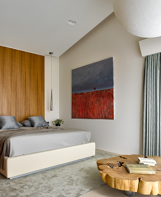 Одна из гостевых спален на втором этаже. В каждой жилой комнате потолок имеет свою конфигурацию: это придает помещениям индивидуальность, в то же время стилистически связывает их между собой. Столик сделан из спила каштана. Люстра из серии Luna, In-es.artdesign. На стене работа Сергея Карева.