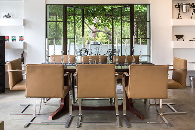 Внутри — большие, открытые, наполненные светом пространства, хорошо расположенные окна и стеклянные стены. Многие комнаты, в том числе главная гостиная, выходят на террасы, где всегда есть место для обедов, развлечений или медитации среди высоких деревьев, папоротников и виноградных лоз.