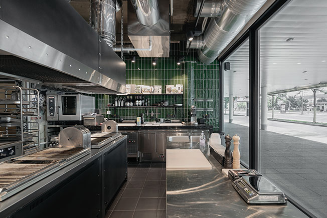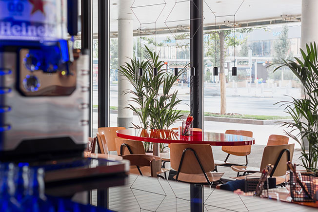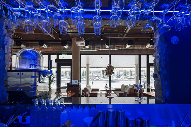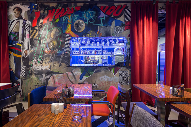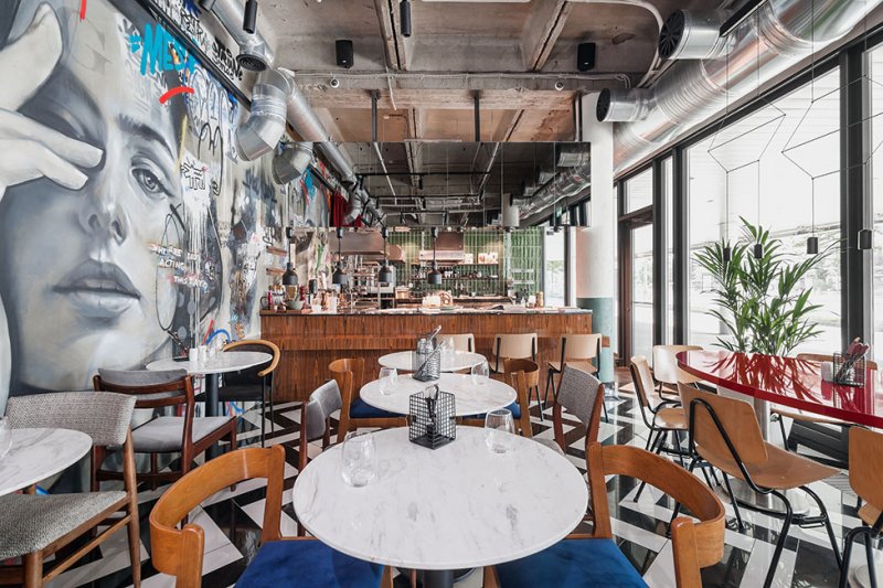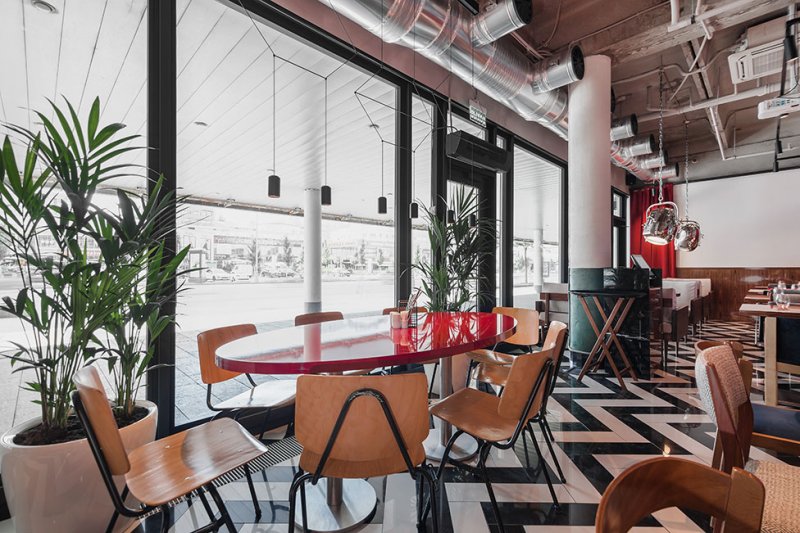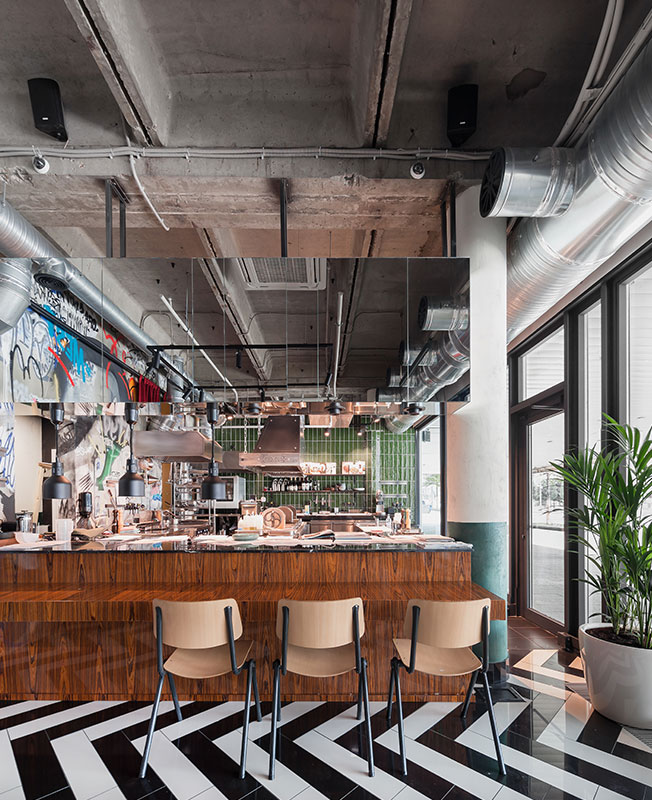 Заведение площадью 140 кв. метров расположилось в здании бывшего офиса. После размещения всего необходимого профессионального оборудования вопрос планировки отпал сам собой — дизайнерам достался прямоугольный зал, в котором необходимо было разместить 50—55 посадочных мест.